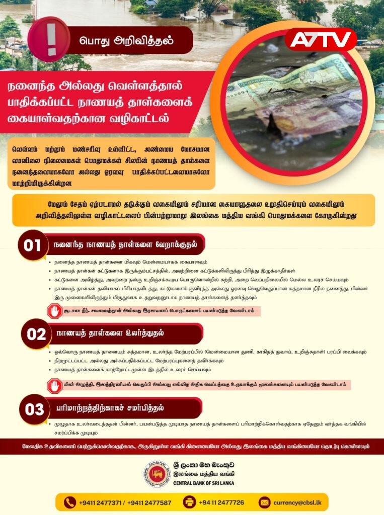 சீரற்ற வானிலை காரணமாக நனைந்த அல்லது வெள்ளத்தால் பாதிக்கப்பட்ட நாணயத் தாள்களைக் கையாள்வது தொடர்பில் இலங்கை மத்திய வங்கி வழிகாட்டல்களை வெளியிட்டுள்ளது.