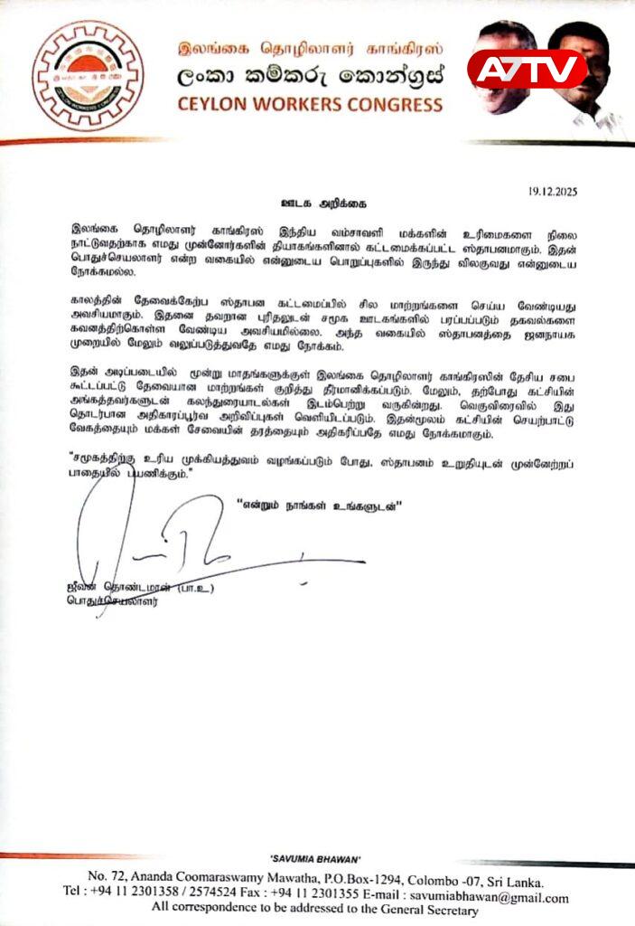 இலங்கை தொழிலாளர் காங்கிரஸ் (இ.தொ.கா) இந்திய வம்சாவளி மக்களின் உரிமைகளை நிலை நாட்டுவதற்காக எமது முன்னோர்களின் தியாகங்களினால் கட்டமைக்கப்பட்ட ஸ்தாபனமாகும். இதன் பொதுச்செயலாளர் என்ற வகையில் என்னுடைய பொறுப்புகளில் இருந்து விலகுவது என்னுடைய நோக்கமல்ல.