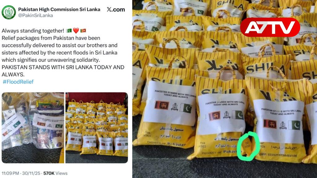 இந்தநிலையில் பாகிஸ்தானில் இருந்து இலங்கைக்கு கொண்டு வரப்பட்ட நிவாரண பொருட்கள் காலாவதியானவை என சமூக வலைதளங்களில் பகிரப்பட்டு வரும் புகைப்படங்களில், குறித்த பொருட்களில் காலாவதி திகதி என 2024ஆம் ஆண்டு அச்சிடப்பட்டுள்ளது.