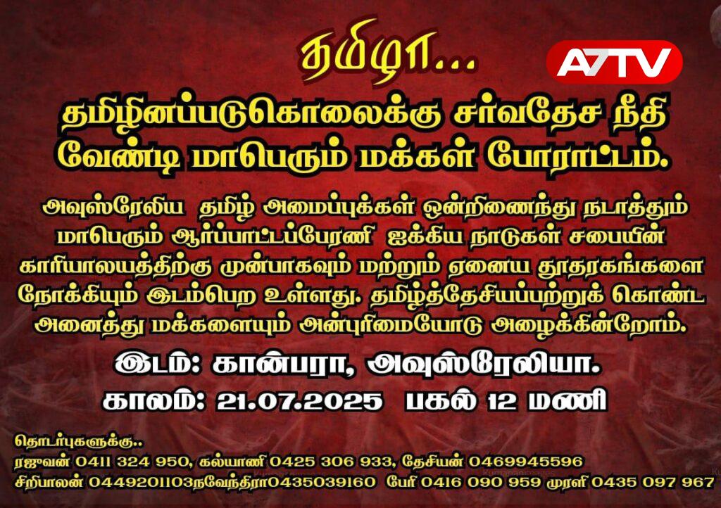 அவுஸ்ரேலிய தமிழ் அமைப்புக்கள் ஒன்றிணைந்து நடத்தும் மாபெரும் ஆர்ப்பாட்ட பேரணி ஐக்கியநாடுகள் சபையின் காரியாலயத்திற்கு முன்பாகவும் மற்றும் ஏனைய தூதரங்களை நோக்கியும் இடம்பெற உள்ளது. குறித்த ஆர்ப்பாட்ட பேரணிக்கு தமிழ்தேசிய பற்றுக்கொண்ட அனைத்து மக்களையும் அன்புரிமையோடு அழைக்கின்றோம் என ஏற்பாட்டாளர்களால் அழைப்பு விடுக்கப்பட்டுள்ளது.