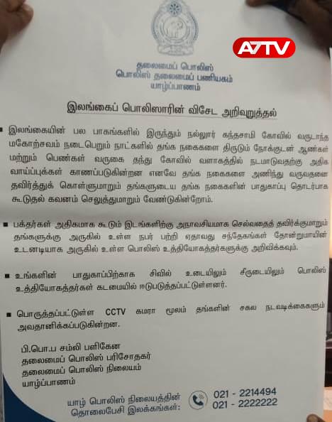 ஆலய சூழலில் திருடர்களின் நடமாட்டம் காணப்படுவதால், ஆலயத்திற்கு தங்க நகைகளை அணிந்து வருவதை தவிர்க்குமாறும் , அணிந்துள்ள தங்க நகைகளில் கவனம் செலுத்துமாறும் பொலிஸார் கோரியுள்ளனர்.