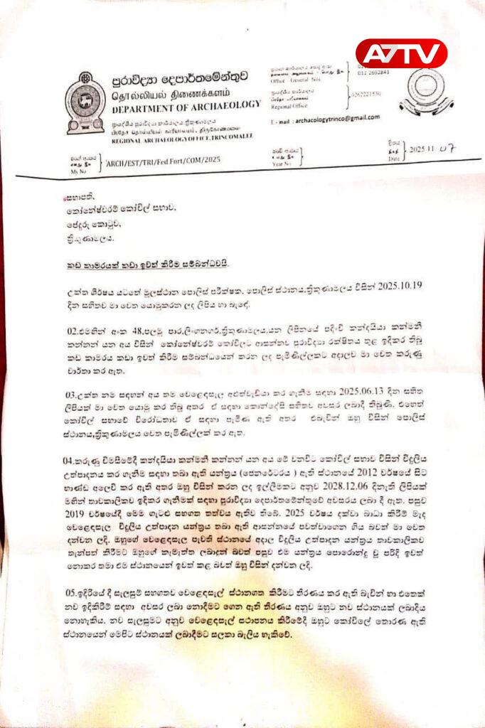 தொல்பொருள் திணைக்களம் ஆலய பகுதியில் வர்த்தக நிலையம் அமைக்க தாம் அனுமதி வழங்கியுள்ளதால், அவர் அதனை அமைக்க நிர்வாக சபையினர் மின்பிறப்பாக்கி வைத்துள்ள பகுதியை வழங்கும்படி நவம்பர் 7ஆம் திகதியிட்டு கடிதம் அனுப்பியுள்ளது.